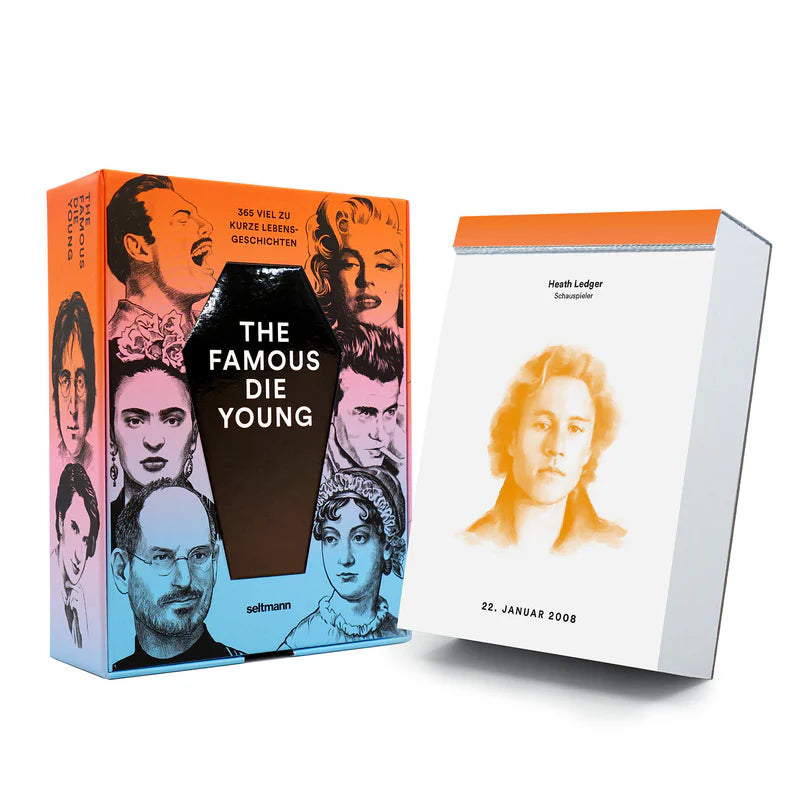 365 Todestage, 365 Todesarten, 365 ­spannend erzählte Biografien. Gute Geschichten entbehren zuweilen nicht einer gewissen Tragik. Und was mutet tragischer an als ein viel zu früher Tod? Der kurzweilige ­Tageskalender spielt mit der Faszination für tragische, mit­unter ­aberwitzige Todesfälle. An jedem Tag im Jahr erzählt der Abreisskalender die inspirierende Lebensgeschichte einer zu jung gestorbenen Ikone. Ob James Dean, Jeanne d’Arc oder Friedrich Schiller – das plötzliche Ableben dieser Helden erschüttert die Nachwelt. Die Protagonisten sind Pioniere ihres Fachs, wahre Genies, mutige ­Erfinder, gefeierte Stars, gefallene Helden, ­tapfere Kämpfer, verarmte Denker, außergewöhnliche Sportskanonen und musikalische Ausnahme­talente. Ein illustrer Kreis aus wahren Legenden, die in jungen Jahren Großes leisten und die Grenzen ihrer Zeit verschieben. 370 Seiten ISBN 9783949070570 / 9783949070655 (EN) Maße 11,5 cm × 16 cm
